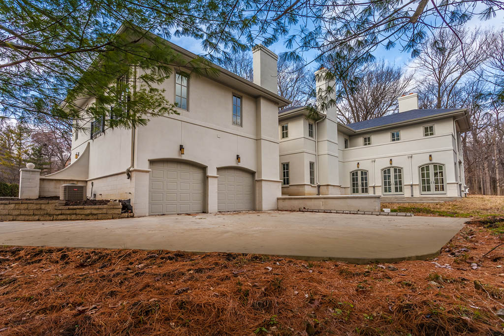 Custom built house on hilly, wooded lot withh protruded windows arched garage door top.